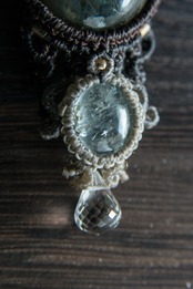 マダガスカル産ラブラドライトとアクアマリン、カッティング水晶のマクラメペンダントになります。