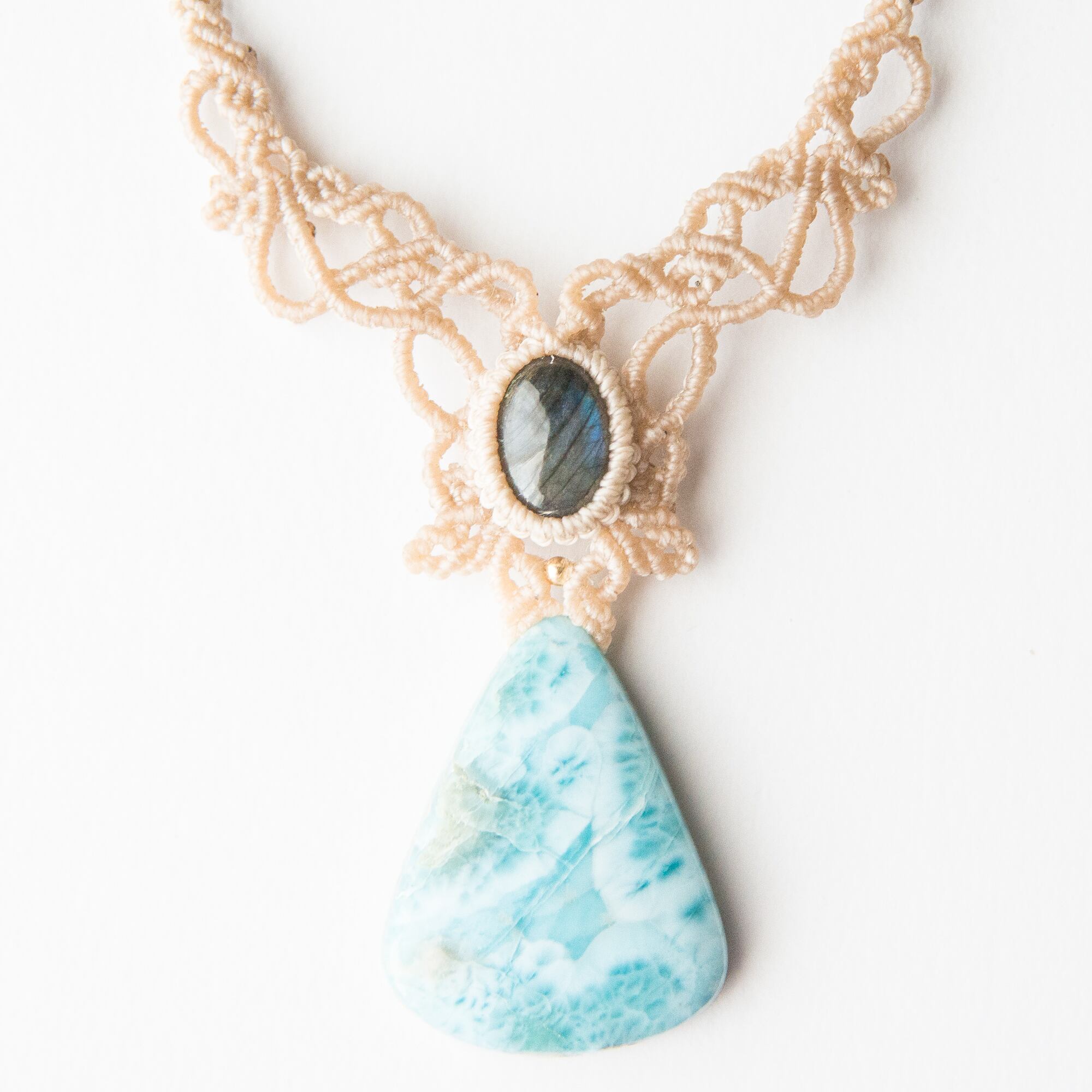ドミニカ産ラリマーとマダガスカル産ラブラドライトのマクラメネックレスになります。