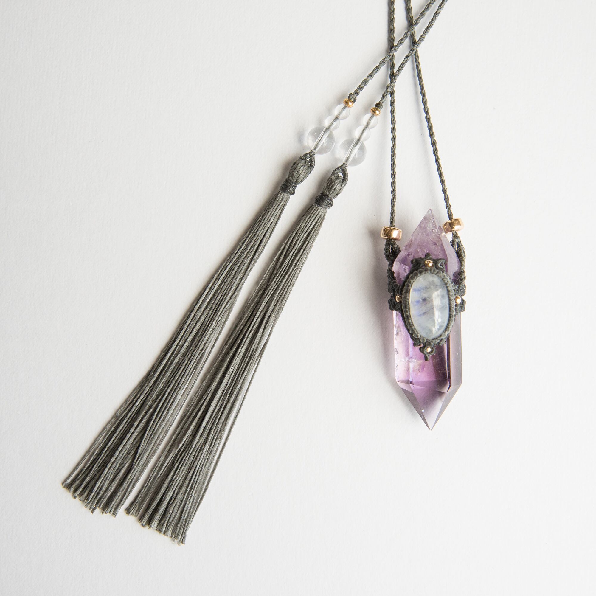 クラスターカットのアメトリンとマダガスカル産ムーンストーンのマクラメペンダントになります。